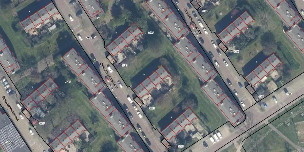 Het perceel waarop Dotterbloemstraat 35 staat heeft een oppervlakte van 8666 m². Dit is een zeer groot perceel. De perceeloppervlakte wordt geregistreerd door het Kadaster. Gedetailleerde informatie over de maten van dit perceel kunt u vinden in het rapport Kadastrale kaart met maatvoering van Dotterbloemstraat 35.