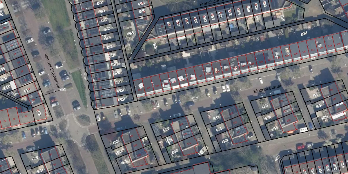 Eleonorastraat 110 is gelegen op kadastraal perceel VDG00G3405. Deze kadastrale aanduiding is uniek en wordt gebruikt door het Kadaster om eigendomsrechten en andere zakelijke rechten vast te leggen. Het perceel maakt onderdeel uit van de kadastrale gemeente Vlaardingen.