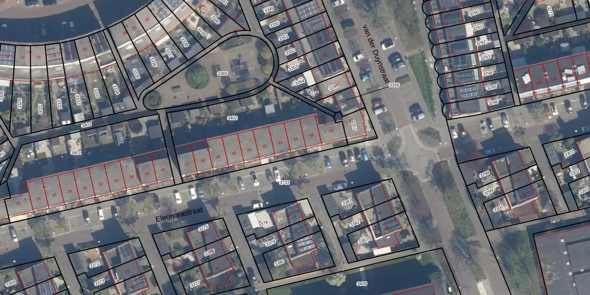 Eleonorastraat 56 is gelegen op kadastraal perceel VDG00G3402. Deze kadastrale aanduiding is uniek en wordt gebruikt door het Kadaster om eigendomsrechten en andere zakelijke rechten vast te leggen. Het perceel maakt onderdeel uit van de kadastrale gemeente Vlaardingen.
