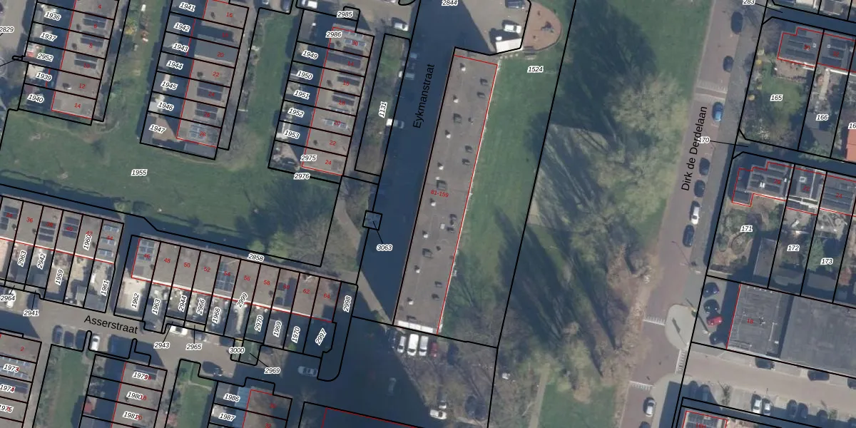 Het perceel waarop Eykmanstraat 159 staat heeft een oppervlakte van 3618 m². Dit is een zeer groot perceel. De perceeloppervlakte wordt geregistreerd door het Kadaster. Gedetailleerde informatie over de maten van dit perceel kunt u vinden in het rapport Kadastrale kaart met maatvoering van Eykmanstraat 159.
