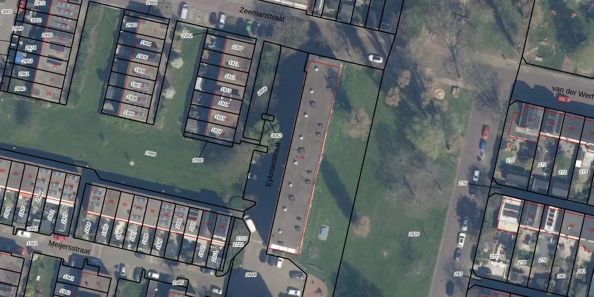 Het perceel waarop Eykmanstraat 69 staat heeft een oppervlakte van 3618 m². Dit is een zeer groot perceel. De perceeloppervlakte wordt geregistreerd door het Kadaster. Gedetailleerde informatie over de maten van dit perceel kunt u vinden in het rapport Kadastrale kaart met maatvoering van Eykmanstraat 69.
