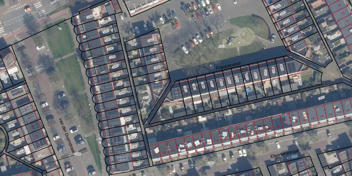Het perceel waarop Franciscahof 21 staat heeft een oppervlakte van 247 m². Dit is een middelgroot perceel. De perceeloppervlakte wordt geregistreerd door het Kadaster. Gedetailleerde informatie over de maten van dit perceel kunt u vinden in het rapport Kadastrale kaart met maatvoering van Franciscahof 21.