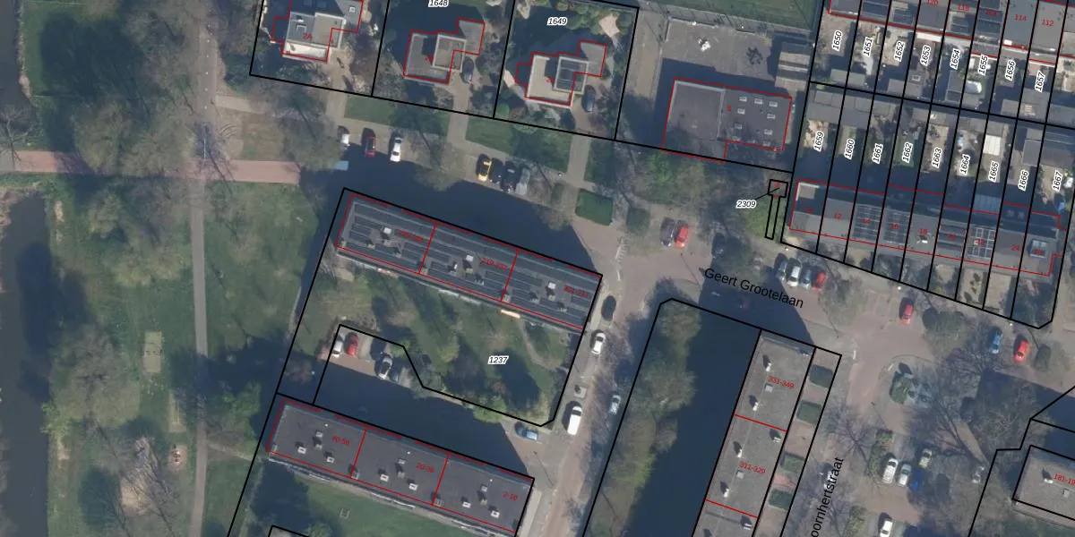 Het perceel waarop Geert Grootelaan 217 staat heeft een oppervlakte van 1500 m². Dit is een zeer groot perceel. De perceeloppervlakte wordt geregistreerd door het Kadaster. Gedetailleerde informatie over de maten van dit perceel kunt u vinden in het rapport Kadastrale kaart met maatvoering van Geert Grootelaan 217.