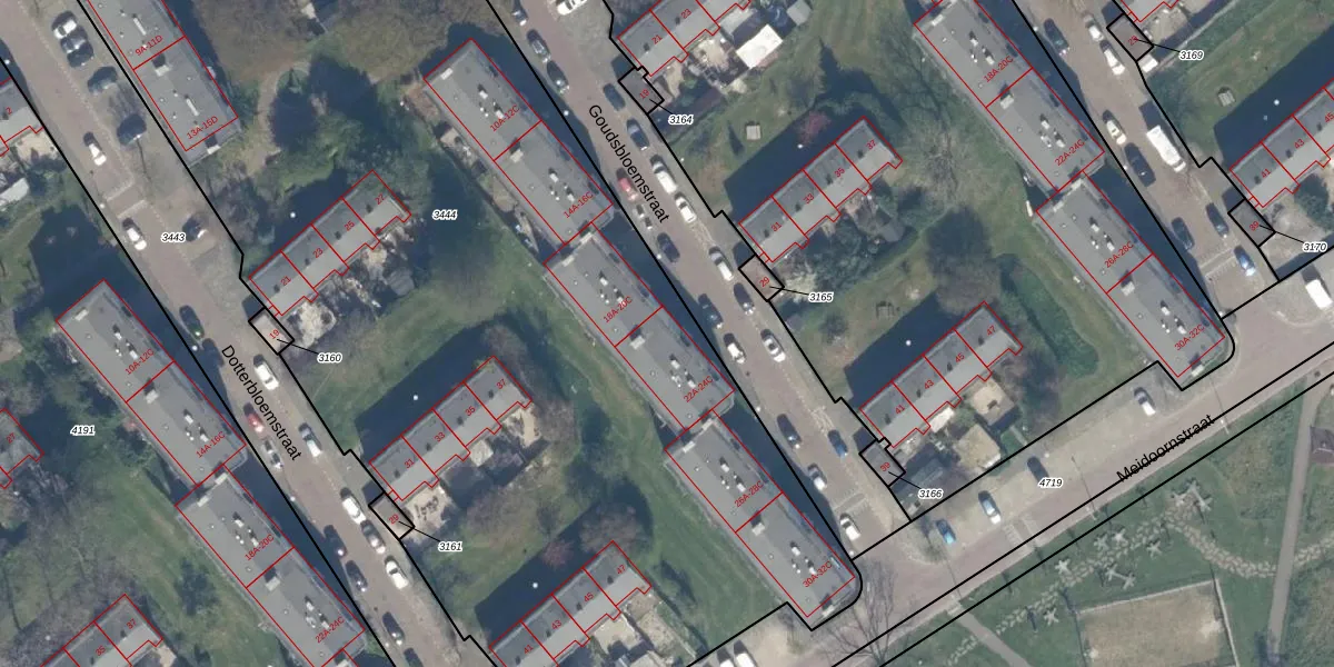 Het perceel waarop Goudsbloemstraat 24-A staat heeft een oppervlakte van 8666 m². Dit is een zeer groot perceel. De perceeloppervlakte wordt geregistreerd door het Kadaster. Gedetailleerde informatie over de maten van dit perceel kunt u vinden in het rapport Kadastrale kaart met maatvoering van Goudsbloemstraat 24-A.