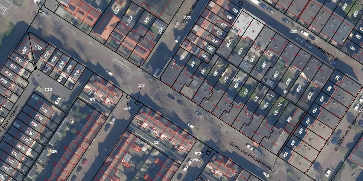 Groen van Prinstererstraat 13 is gelegen op kadastraal perceel VDG00D916. Deze kadastrale aanduiding is uniek en wordt gebruikt door het Kadaster om eigendomsrechten en andere zakelijke rechten vast te leggen. Het perceel maakt onderdeel uit van de kadastrale gemeente Vlaardingen.