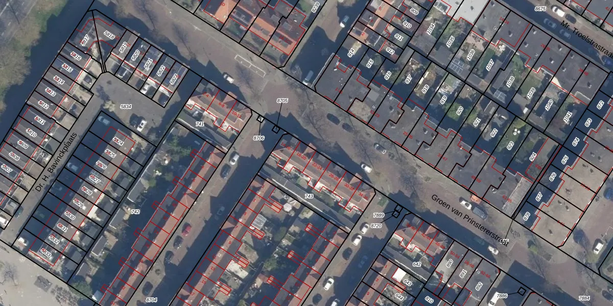Het perceel waarop Groen van Prinstererstraat 20 staat heeft een oppervlakte van 613 m². Dit is een groot perceel. De perceeloppervlakte wordt geregistreerd door het Kadaster. Gedetailleerde informatie over de maten van dit perceel kunt u vinden in het rapport Kadastrale kaart met maatvoering van Groen van Prinstererstraat 20.