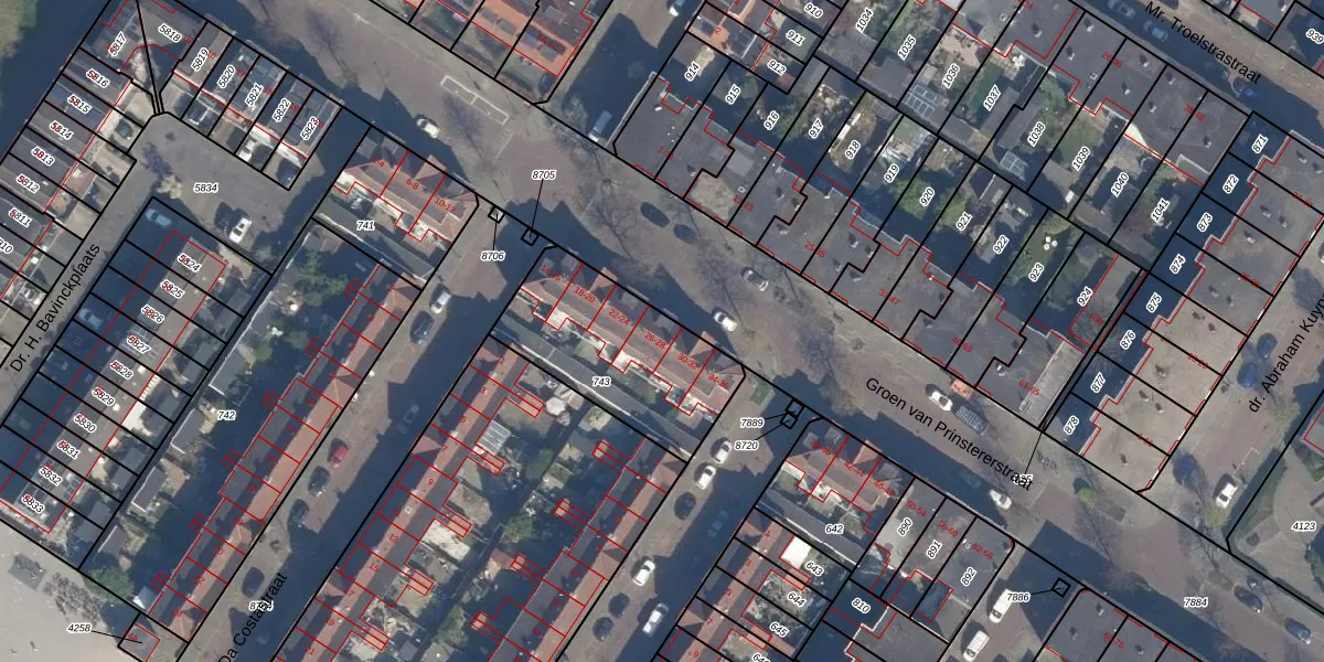 Het perceel waarop Groen van Prinstererstraat 28 staat heeft een oppervlakte van 613 m². Dit is een groot perceel. De perceeloppervlakte wordt geregistreerd door het Kadaster. Gedetailleerde informatie over de maten van dit perceel kunt u vinden in het rapport Kadastrale kaart met maatvoering van Groen van Prinstererstraat 28.