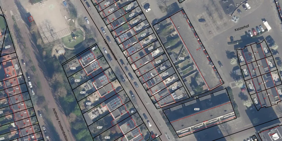 Hartmansstraat 74 is gelegen op kadastraal perceel VDG00G3643. Deze kadastrale aanduiding is uniek en wordt gebruikt door het Kadaster om eigendomsrechten en andere zakelijke rechten vast te leggen. Het perceel maakt onderdeel uit van de kadastrale gemeente Vlaardingen.