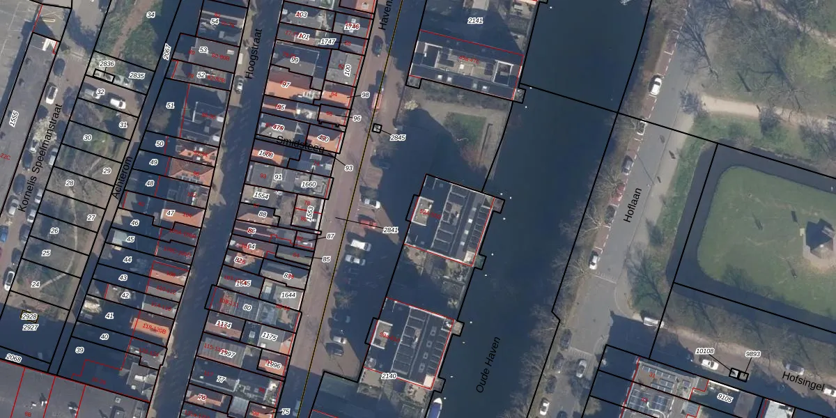 Het perceel waarop Havenstraat 55-D staat heeft een oppervlakte van 1721 m². Dit is een zeer groot perceel. De perceeloppervlakte wordt geregistreerd door het Kadaster. Gedetailleerde informatie over de maten van dit perceel kunt u vinden in het rapport Kadastrale kaart met maatvoering van Havenstraat 55-D.