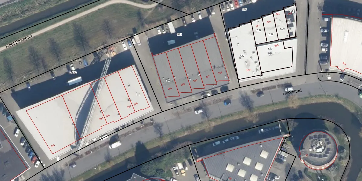 Het perceel waarop Hoogstad 253 staat heeft een oppervlakte van 2245 m². Dit is een zeer groot perceel. De perceeloppervlakte wordt geregistreerd door het Kadaster. Gedetailleerde informatie over de maten van dit perceel kunt u vinden in het rapport Kadastrale kaart met maatvoering van Hoogstad 253.