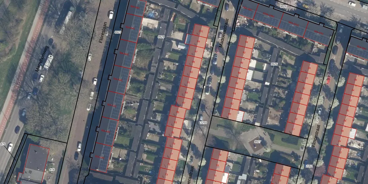 Het perceel waarop Madoerastraat 89 staat heeft een oppervlakte van 6722 m². Dit is een zeer groot perceel. De perceeloppervlakte wordt geregistreerd door het Kadaster. Gedetailleerde informatie over de maten van dit perceel kunt u vinden in het rapport Kadastrale kaart met maatvoering van Madoerastraat 89.