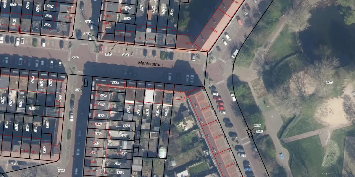 Het perceel waarop Mahlerstraat 1-B staat heeft een oppervlakte van 3739 m². Dit is een zeer groot perceel. De perceeloppervlakte wordt geregistreerd door het Kadaster. Gedetailleerde informatie over de maten van dit perceel kunt u vinden in het rapport Kadastrale kaart met maatvoering van Mahlerstraat 1-B.