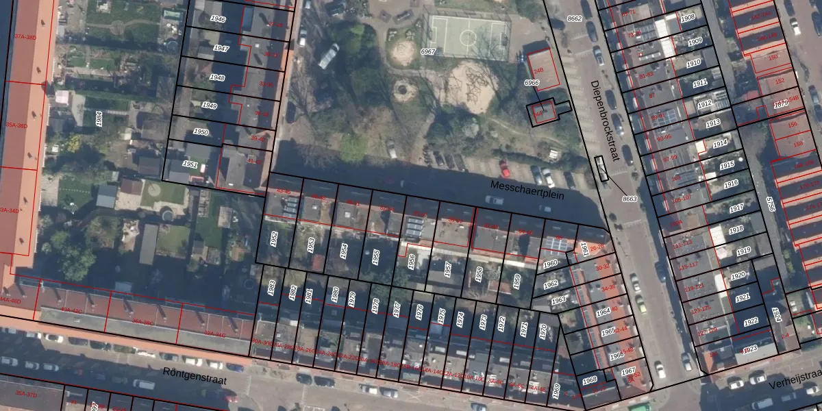 Het perceel waarop Messchaertplein 55 staat heeft een oppervlakte van 188 m². Dit is een middelgroot perceel. De perceeloppervlakte wordt geregistreerd door het Kadaster. Gedetailleerde informatie over de maten van dit perceel kunt u vinden in het rapport Kadastrale kaart met maatvoering van Messchaertplein 55.