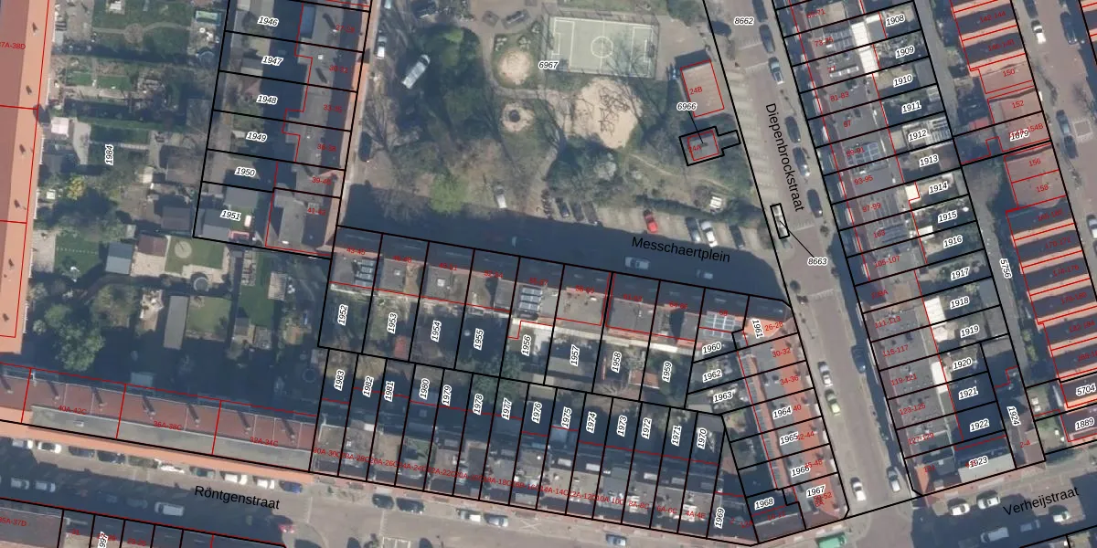 Het perceel waarop Messchaertplein 57 staat heeft een oppervlakte van 188 m². Dit is een middelgroot perceel. De perceeloppervlakte wordt geregistreerd door het Kadaster. Gedetailleerde informatie over de maten van dit perceel kunt u vinden in het rapport Kadastrale kaart met maatvoering van Messchaertplein 57.