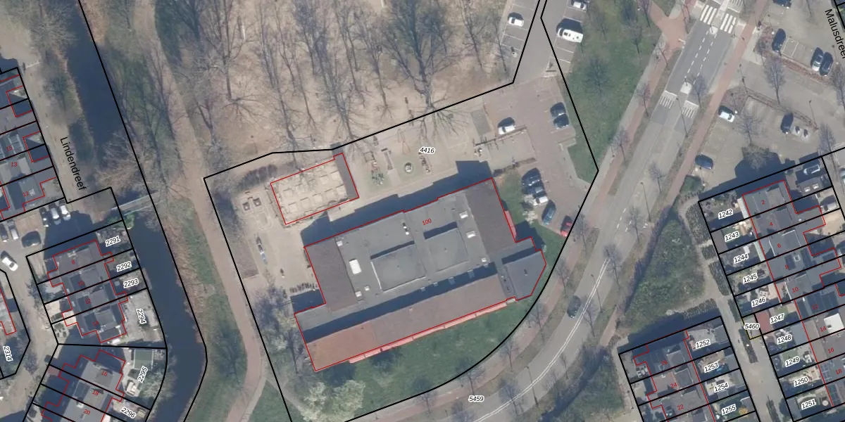 Het perceel waarop Olmendreef 100 staat heeft een oppervlakte van 4972 m². Dit is een zeer groot perceel. De perceeloppervlakte wordt geregistreerd door het Kadaster. Gedetailleerde informatie over de maten van dit perceel kunt u vinden in het rapport Kadastrale kaart met maatvoering van Olmendreef 100.