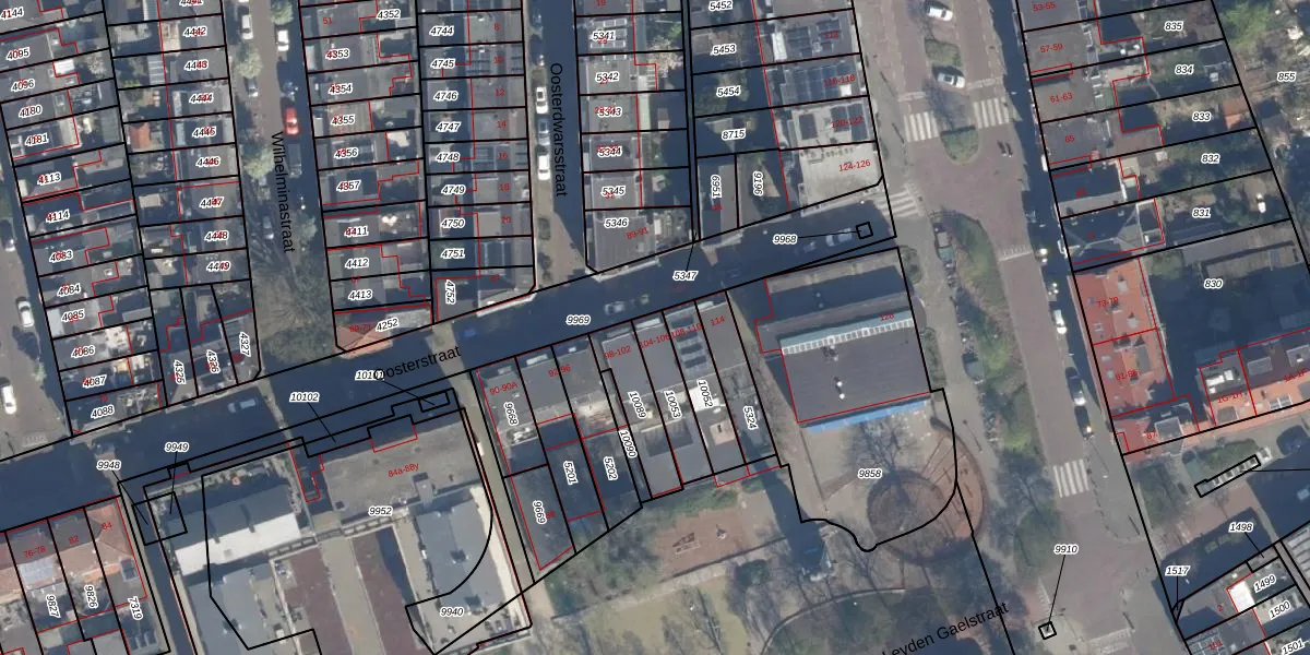 Oosterstraat 106 is gelegen op kadastraal perceel VDG00B10053. Deze kadastrale aanduiding is uniek en wordt gebruikt door het Kadaster om eigendomsrechten en andere zakelijke rechten vast te leggen. Het perceel maakt onderdeel uit van de kadastrale gemeente Vlaardingen.
