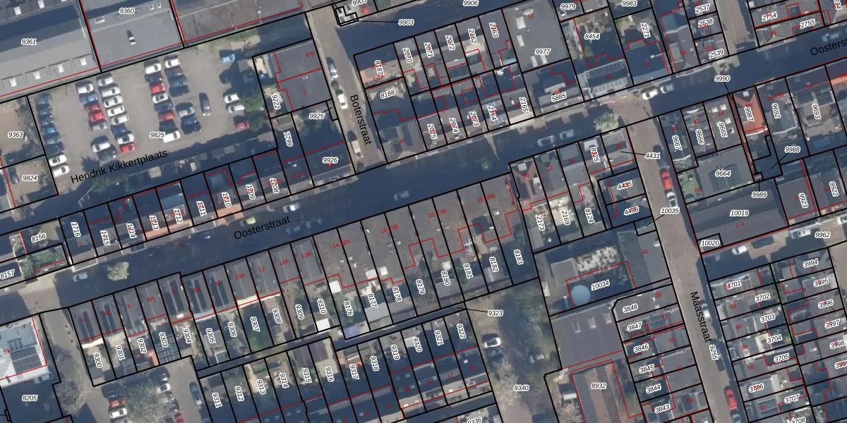 Oosterstraat 22-A is gelegen op kadastraal perceel VDG00B8180. Deze kadastrale aanduiding is uniek en wordt gebruikt door het Kadaster om eigendomsrechten en andere zakelijke rechten vast te leggen. Het perceel maakt onderdeel uit van de kadastrale gemeente Vlaardingen.