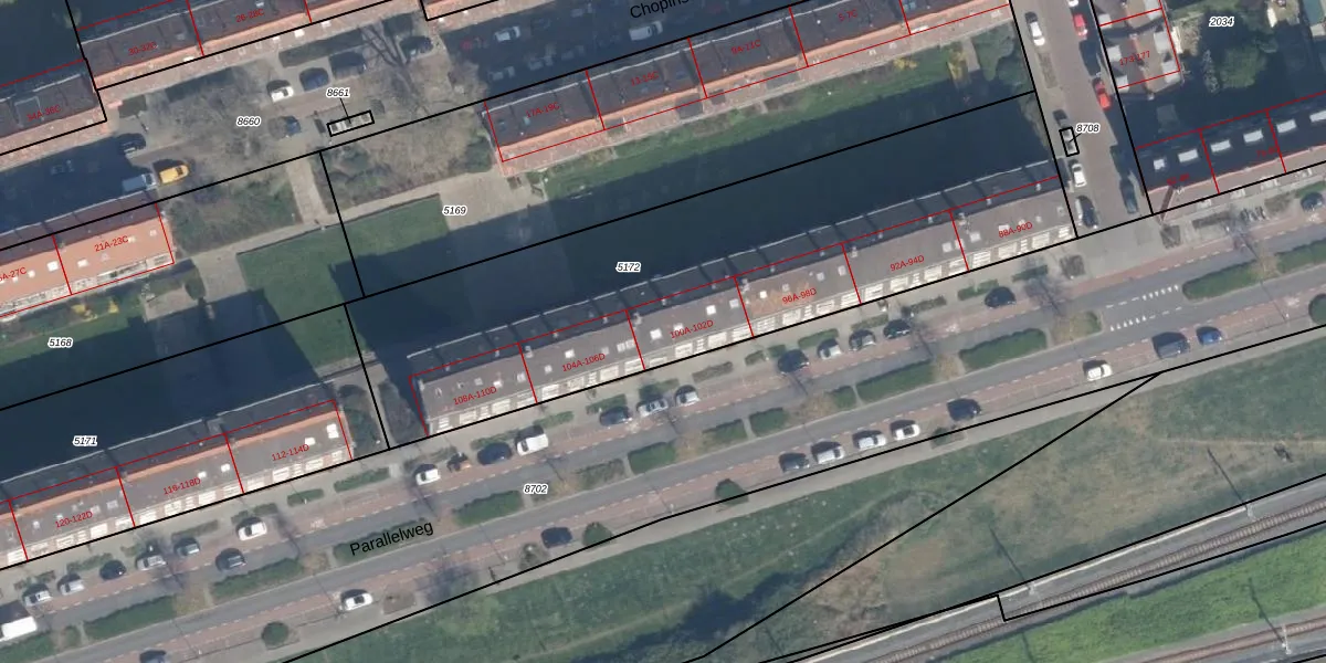 Parallelweg 102-D is gelegen op kadastraal perceel VDG00D5172. Deze kadastrale aanduiding is uniek en wordt gebruikt door het Kadaster om eigendomsrechten en andere zakelijke rechten vast te leggen. Het perceel maakt onderdeel uit van de kadastrale gemeente Vlaardingen.