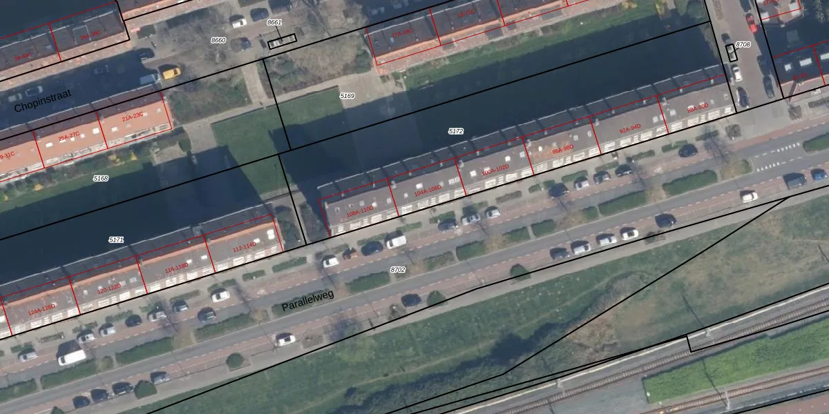 Parallelweg 106-A is gelegen op kadastraal perceel VDG00D5172. Deze kadastrale aanduiding is uniek en wordt gebruikt door het Kadaster om eigendomsrechten en andere zakelijke rechten vast te leggen. Het perceel maakt onderdeel uit van de kadastrale gemeente Vlaardingen.
