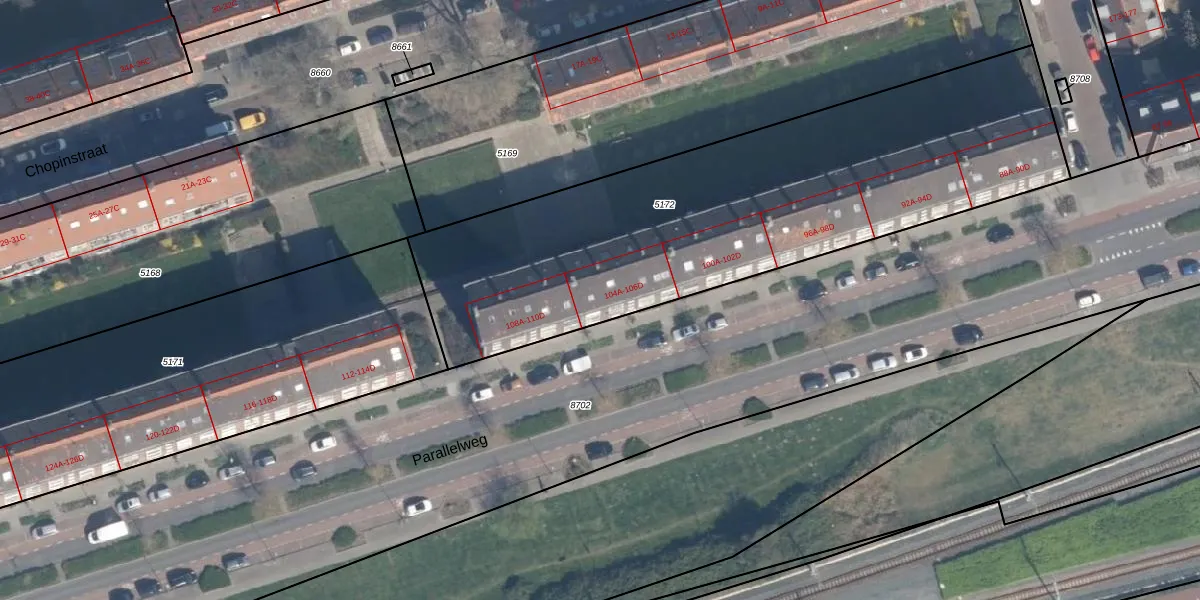 Parallelweg 106-C is gelegen op kadastraal perceel VDG00D5172. Deze kadastrale aanduiding is uniek en wordt gebruikt door het Kadaster om eigendomsrechten en andere zakelijke rechten vast te leggen. Het perceel maakt onderdeel uit van de kadastrale gemeente Vlaardingen.