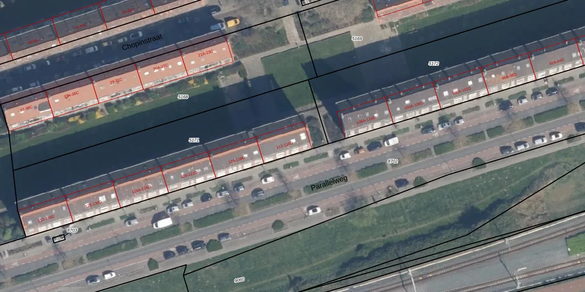 Parallelweg 112 is gelegen op kadastraal perceel VDG00D5171. Deze kadastrale aanduiding is uniek en wordt gebruikt door het Kadaster om eigendomsrechten en andere zakelijke rechten vast te leggen. Het perceel maakt onderdeel uit van de kadastrale gemeente Vlaardingen.
