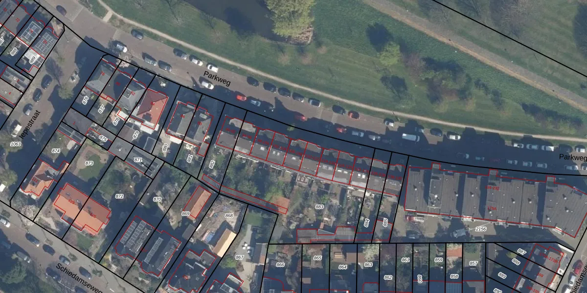Parkweg 106 is gelegen op kadastraal perceel VDG00M883. Deze kadastrale aanduiding is uniek en wordt gebruikt door het Kadaster om eigendomsrechten en andere zakelijke rechten vast te leggen. Het perceel maakt onderdeel uit van de kadastrale gemeente Vlaardingen.