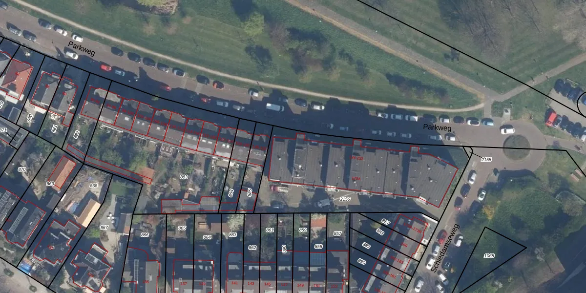 Parkweg 156 is gelegen op kadastraal perceel VDG00M2156. Deze kadastrale aanduiding is uniek en wordt gebruikt door het Kadaster om eigendomsrechten en andere zakelijke rechten vast te leggen. Het perceel maakt onderdeel uit van de kadastrale gemeente Vlaardingen.