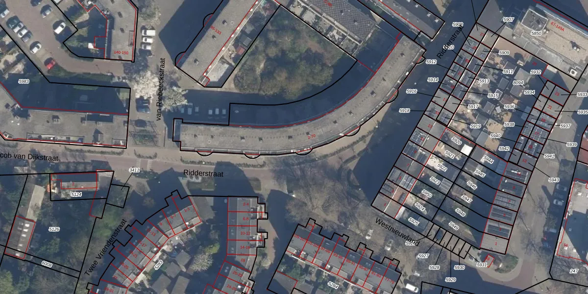 Het perceel waarop Ridderstraat 58 staat heeft een oppervlakte van 2905 m². Dit is een zeer groot perceel. De perceeloppervlakte wordt geregistreerd door het Kadaster. Gedetailleerde informatie over de maten van dit perceel kunt u vinden in het rapport Kadastrale kaart met maatvoering van Ridderstraat 58.