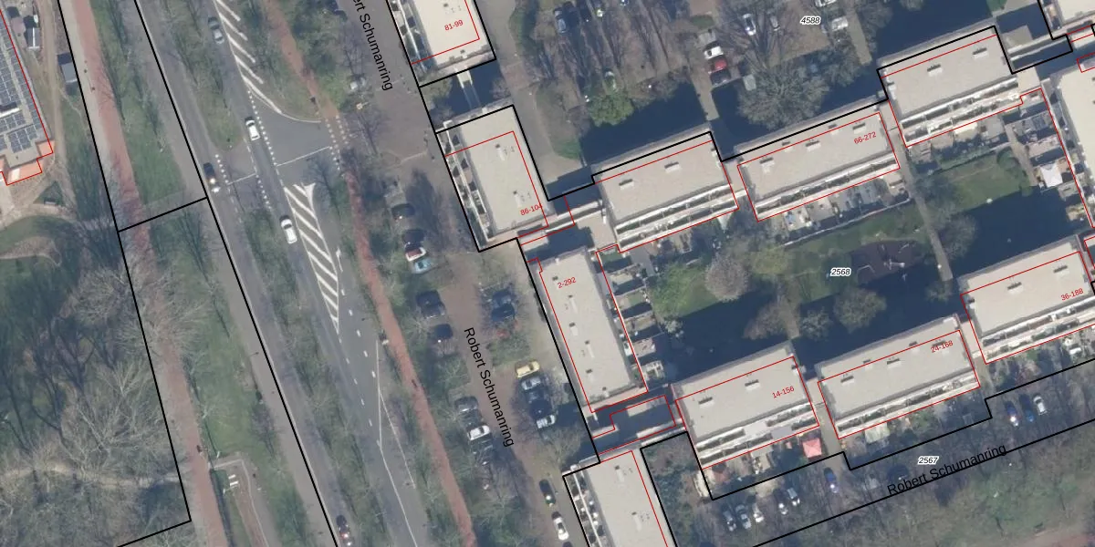 Robert Schumanring 106 is gelegen op kadastraal perceel VDG00K2568. Deze kadastrale aanduiding is uniek en wordt gebruikt door het Kadaster om eigendomsrechten en andere zakelijke rechten vast te leggen. Het perceel maakt onderdeel uit van de kadastrale gemeente Vlaardingen.
