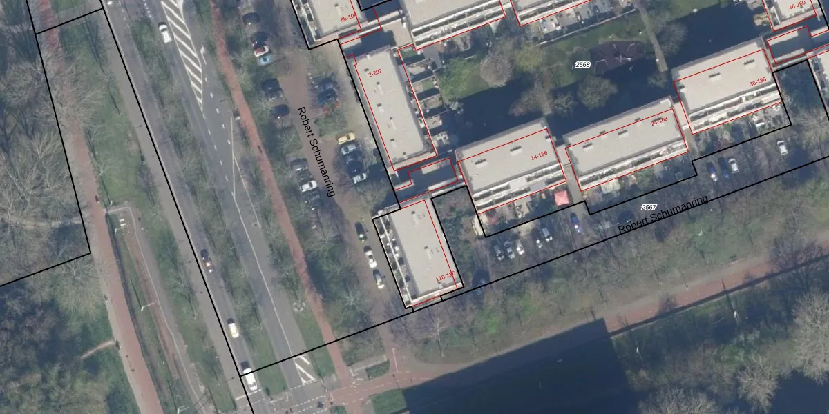 Het perceel waarop Robert Schumanring 118 staat heeft een oppervlakte van 7710 m². Dit is een zeer groot perceel. De perceeloppervlakte wordt geregistreerd door het Kadaster. Gedetailleerde informatie over de maten van dit perceel kunt u vinden in het rapport Kadastrale kaart met maatvoering van Robert Schumanring 118.