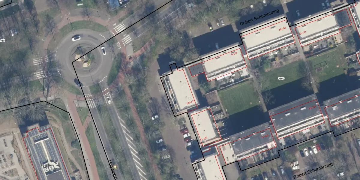 Het perceel waarop Robert Schumanring 119 staat heeft een oppervlakte van 8070 m². Dit is een zeer groot perceel. De perceeloppervlakte wordt geregistreerd door het Kadaster. Gedetailleerde informatie over de maten van dit perceel kunt u vinden in het rapport Kadastrale kaart met maatvoering van Robert Schumanring 119.
