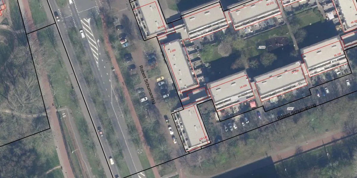 Het perceel waarop Robert Schumanring 12 staat heeft een oppervlakte van 7710 m². Dit is een zeer groot perceel. De perceeloppervlakte wordt geregistreerd door het Kadaster. Gedetailleerde informatie over de maten van dit perceel kunt u vinden in het rapport Kadastrale kaart met maatvoering van Robert Schumanring 12.