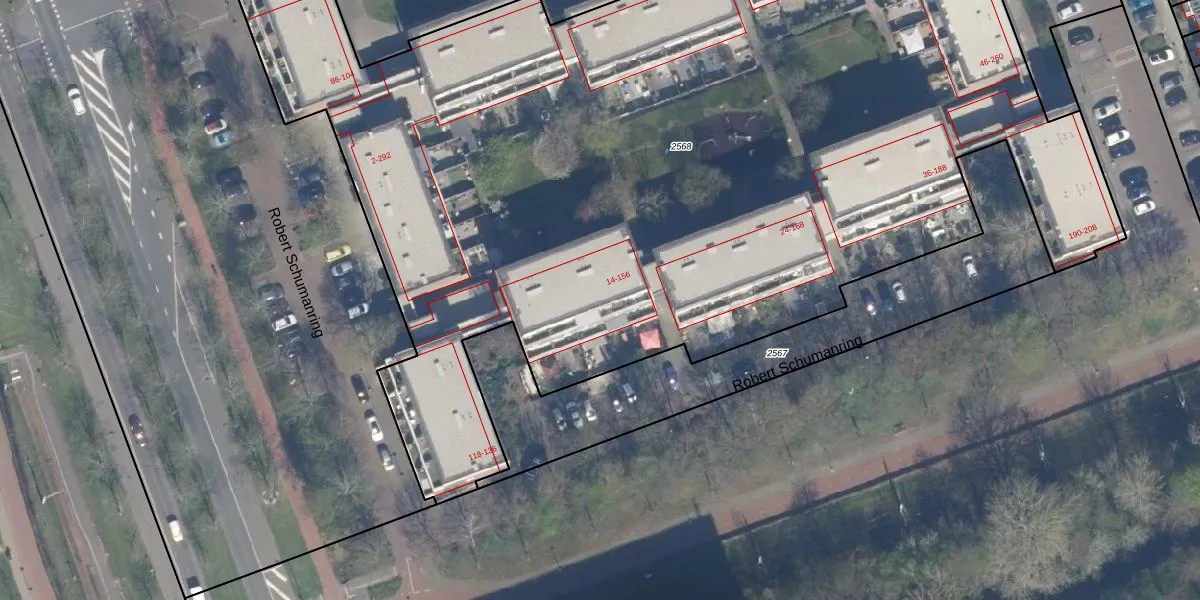 Het perceel waarop Robert Schumanring 150 staat heeft een oppervlakte van 7710 m². Dit is een zeer groot perceel. De perceeloppervlakte wordt geregistreerd door het Kadaster. Gedetailleerde informatie over de maten van dit perceel kunt u vinden in het rapport Kadastrale kaart met maatvoering van Robert Schumanring 150.