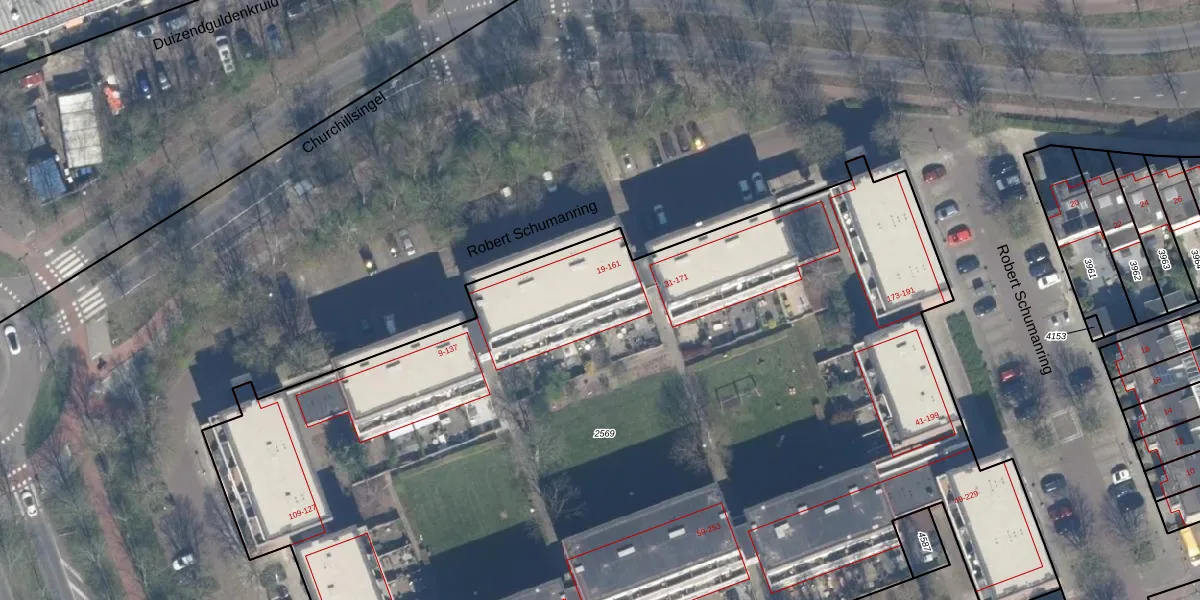 Het perceel waarop Robert Schumanring 155 staat heeft een oppervlakte van 8070 m². Dit is een zeer groot perceel. De perceeloppervlakte wordt geregistreerd door het Kadaster. Gedetailleerde informatie over de maten van dit perceel kunt u vinden in het rapport Kadastrale kaart met maatvoering van Robert Schumanring 155.