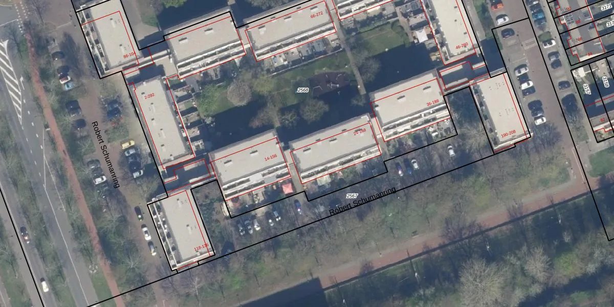 Het perceel waarop Robert Schumanring 160 staat heeft een oppervlakte van 7710 m². Dit is een zeer groot perceel. De perceeloppervlakte wordt geregistreerd door het Kadaster. Gedetailleerde informatie over de maten van dit perceel kunt u vinden in het rapport Kadastrale kaart met maatvoering van Robert Schumanring 160.