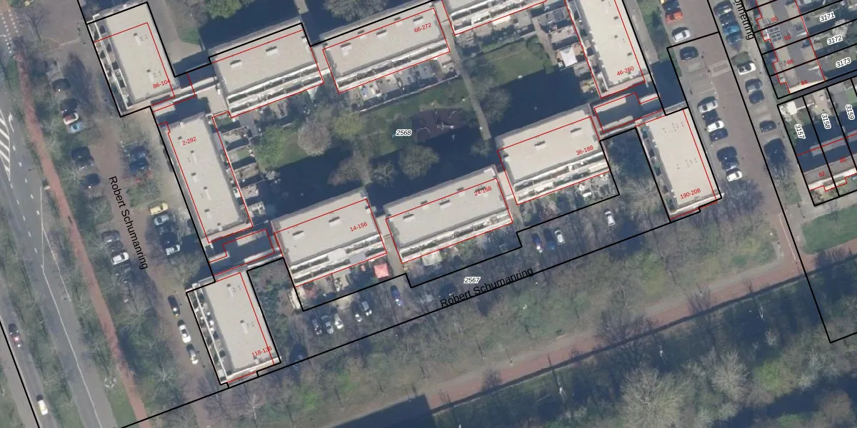 Het perceel waarop Robert Schumanring 162 staat heeft een oppervlakte van 7710 m². Dit is een zeer groot perceel. De perceeloppervlakte wordt geregistreerd door het Kadaster. Gedetailleerde informatie over de maten van dit perceel kunt u vinden in het rapport Kadastrale kaart met maatvoering van Robert Schumanring 162.
