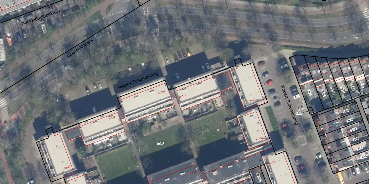 Het perceel waarop Robert Schumanring 165 staat heeft een oppervlakte van 8070 m². Dit is een zeer groot perceel. De perceeloppervlakte wordt geregistreerd door het Kadaster. Gedetailleerde informatie over de maten van dit perceel kunt u vinden in het rapport Kadastrale kaart met maatvoering van Robert Schumanring 165.