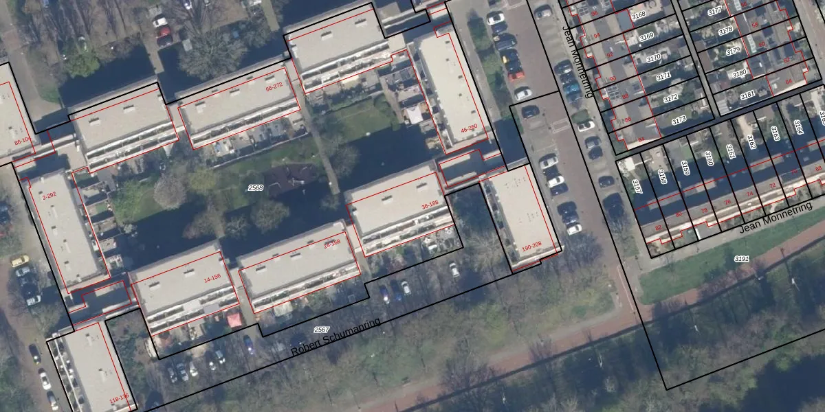 Het perceel waarop Robert Schumanring 182 staat heeft een oppervlakte van 7710 m². Dit is een zeer groot perceel. De perceeloppervlakte wordt geregistreerd door het Kadaster. Gedetailleerde informatie over de maten van dit perceel kunt u vinden in het rapport Kadastrale kaart met maatvoering van Robert Schumanring 182.