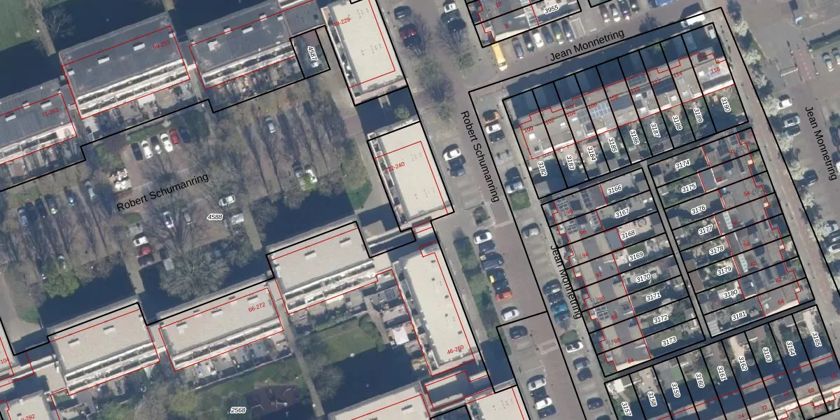 Het perceel waarop Robert Schumanring 222 staat heeft een oppervlakte van 7710 m². Dit is een zeer groot perceel. De perceeloppervlakte wordt geregistreerd door het Kadaster. Gedetailleerde informatie over de maten van dit perceel kunt u vinden in het rapport Kadastrale kaart met maatvoering van Robert Schumanring 222.