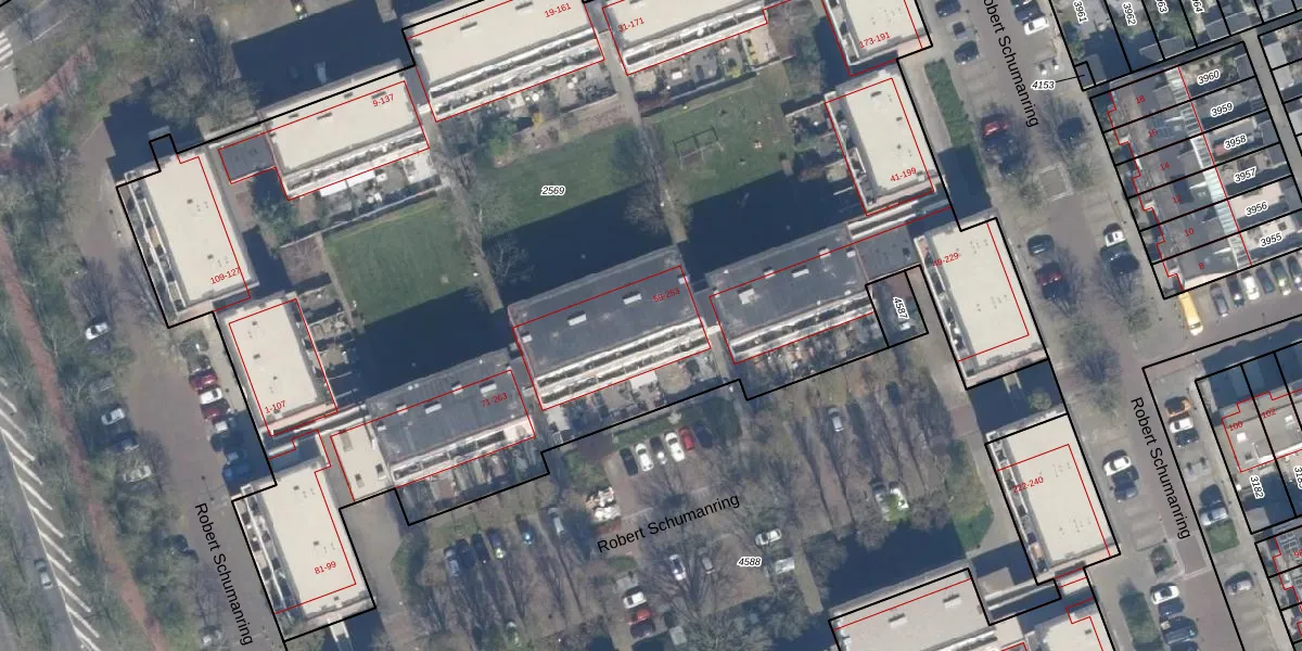 Het perceel waarop Robert Schumanring 237 staat heeft een oppervlakte van 8070 m². Dit is een zeer groot perceel. De perceeloppervlakte wordt geregistreerd door het Kadaster. Gedetailleerde informatie over de maten van dit perceel kunt u vinden in het rapport Kadastrale kaart met maatvoering van Robert Schumanring 237.