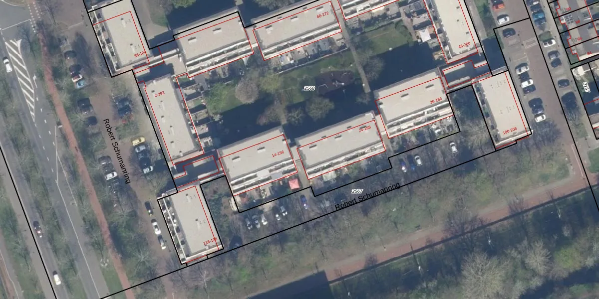 Het perceel waarop Robert Schumanring 24 staat heeft een oppervlakte van 7710 m². Dit is een zeer groot perceel. De perceeloppervlakte wordt geregistreerd door het Kadaster. Gedetailleerde informatie over de maten van dit perceel kunt u vinden in het rapport Kadastrale kaart met maatvoering van Robert Schumanring 24.