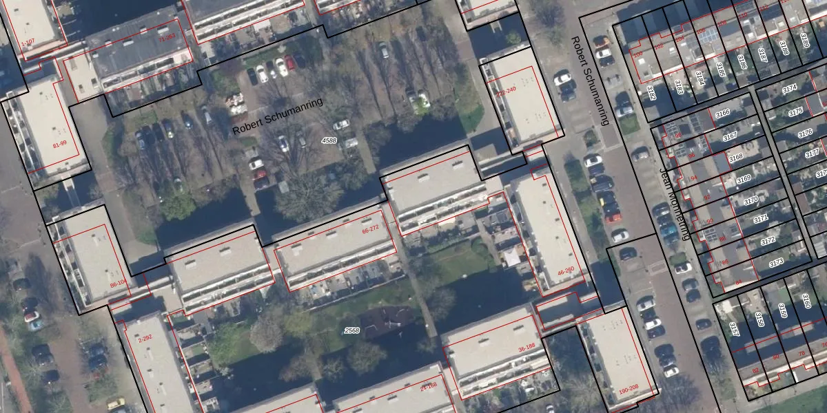 Het perceel waarop Robert Schumanring 254 staat heeft een oppervlakte van 7710 m². Dit is een zeer groot perceel. De perceeloppervlakte wordt geregistreerd door het Kadaster. Gedetailleerde informatie over de maten van dit perceel kunt u vinden in het rapport Kadastrale kaart met maatvoering van Robert Schumanring 254.