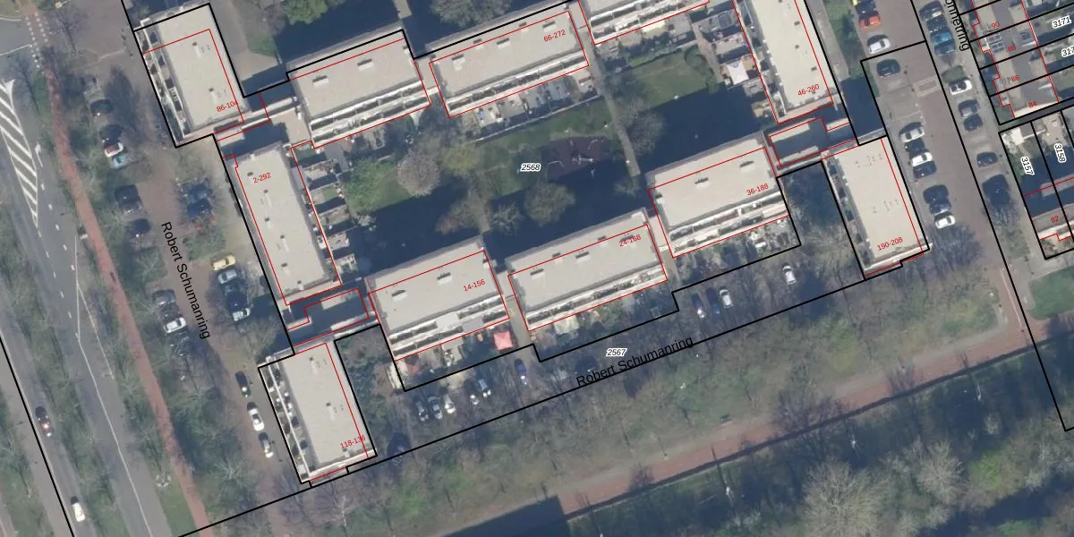 Het perceel waarop Robert Schumanring 26 staat heeft een oppervlakte van 7710 m². Dit is een zeer groot perceel. De perceeloppervlakte wordt geregistreerd door het Kadaster. Gedetailleerde informatie over de maten van dit perceel kunt u vinden in het rapport Kadastrale kaart met maatvoering van Robert Schumanring 26.