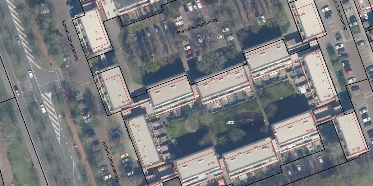 Het perceel waarop Robert Schumanring 274 staat heeft een oppervlakte van 7710 m². Dit is een zeer groot perceel. De perceeloppervlakte wordt geregistreerd door het Kadaster. Gedetailleerde informatie over de maten van dit perceel kunt u vinden in het rapport Kadastrale kaart met maatvoering van Robert Schumanring 274.