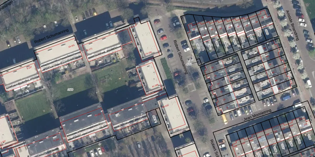Het perceel waarop Robert Schumanring 45 staat heeft een oppervlakte van 8070 m². Dit is een zeer groot perceel. De perceeloppervlakte wordt geregistreerd door het Kadaster. Gedetailleerde informatie over de maten van dit perceel kunt u vinden in het rapport Kadastrale kaart met maatvoering van Robert Schumanring 45.