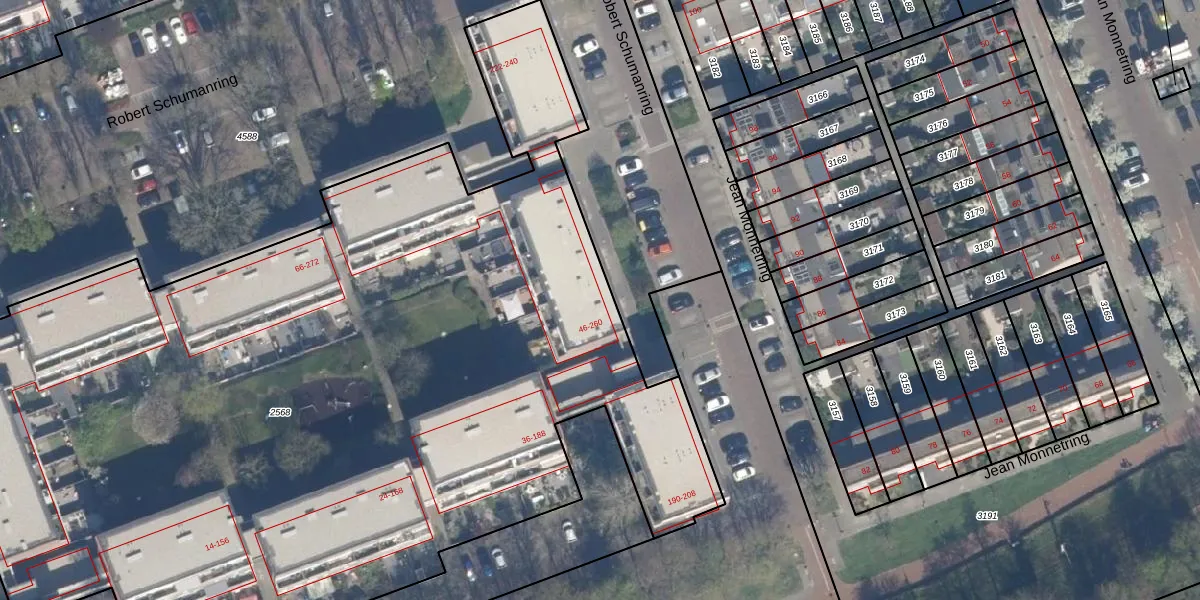 Het perceel waarop Robert Schumanring 48 staat heeft een oppervlakte van 7710 m². Dit is een zeer groot perceel. De perceeloppervlakte wordt geregistreerd door het Kadaster. Gedetailleerde informatie over de maten van dit perceel kunt u vinden in het rapport Kadastrale kaart met maatvoering van Robert Schumanring 48.