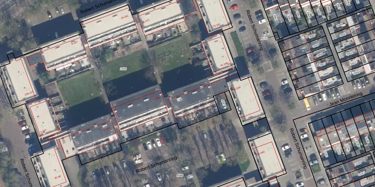 Het perceel waarop Robert Schumanring 53 staat heeft een oppervlakte van 8070 m². Dit is een zeer groot perceel. De perceeloppervlakte wordt geregistreerd door het Kadaster. Gedetailleerde informatie over de maten van dit perceel kunt u vinden in het rapport Kadastrale kaart met maatvoering van Robert Schumanring 53.