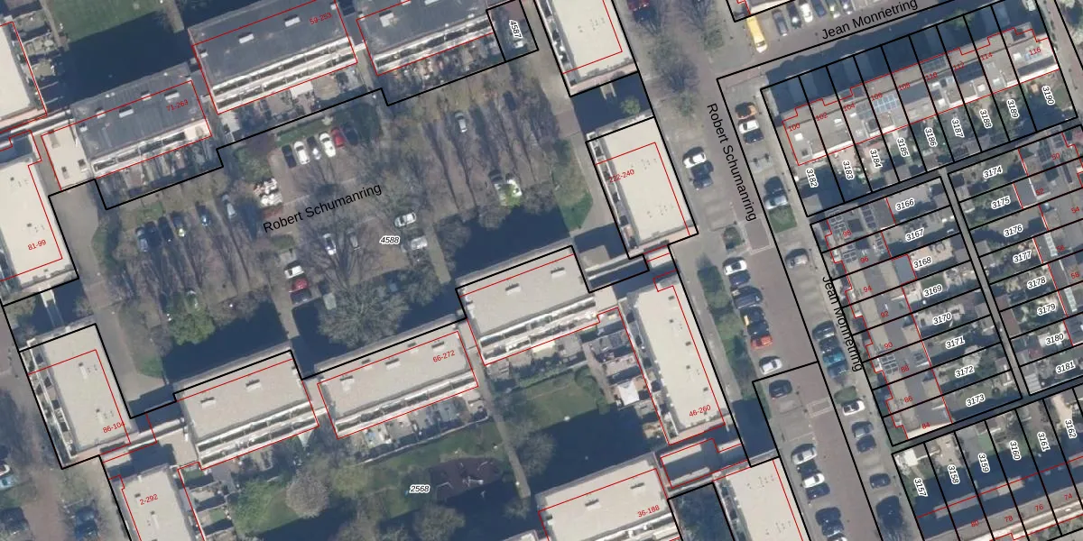 Het perceel waarop Robert Schumanring 58 staat heeft een oppervlakte van 7710 m². Dit is een zeer groot perceel. De perceeloppervlakte wordt geregistreerd door het Kadaster. Gedetailleerde informatie over de maten van dit perceel kunt u vinden in het rapport Kadastrale kaart met maatvoering van Robert Schumanring 58.