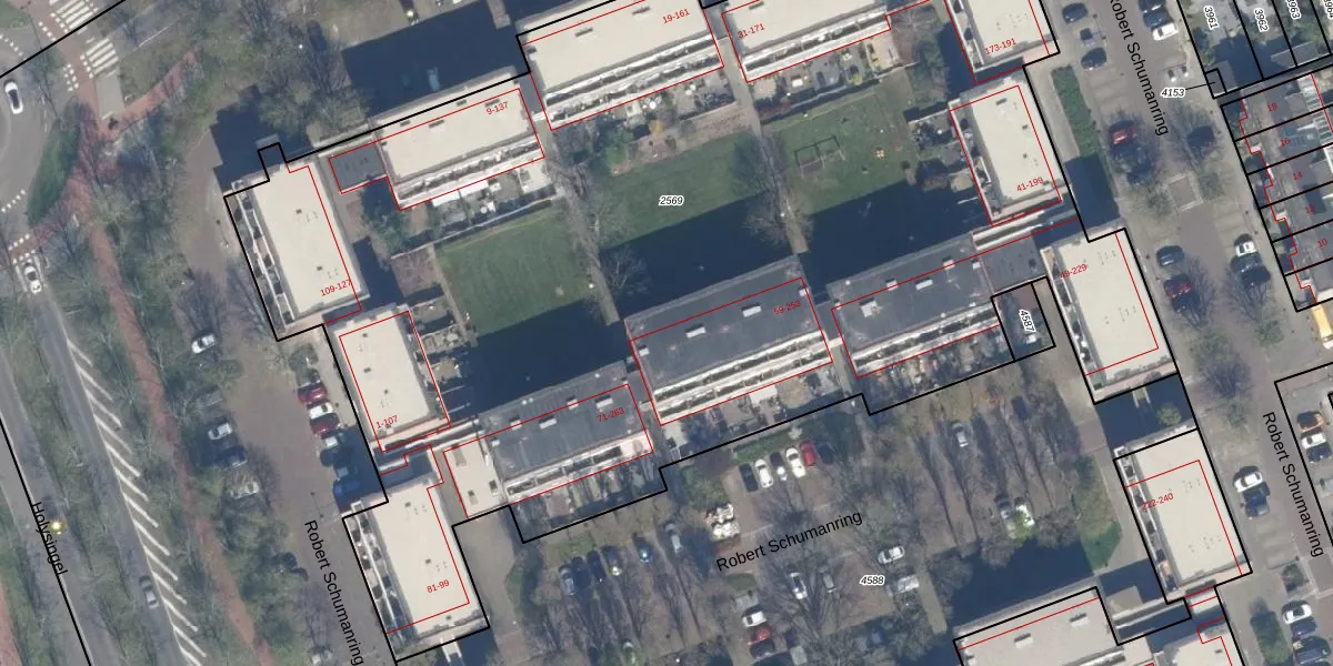 Het perceel waarop Robert Schumanring 67 staat heeft een oppervlakte van 8070 m². Dit is een zeer groot perceel. De perceeloppervlakte wordt geregistreerd door het Kadaster. Gedetailleerde informatie over de maten van dit perceel kunt u vinden in het rapport Kadastrale kaart met maatvoering van Robert Schumanring 67.