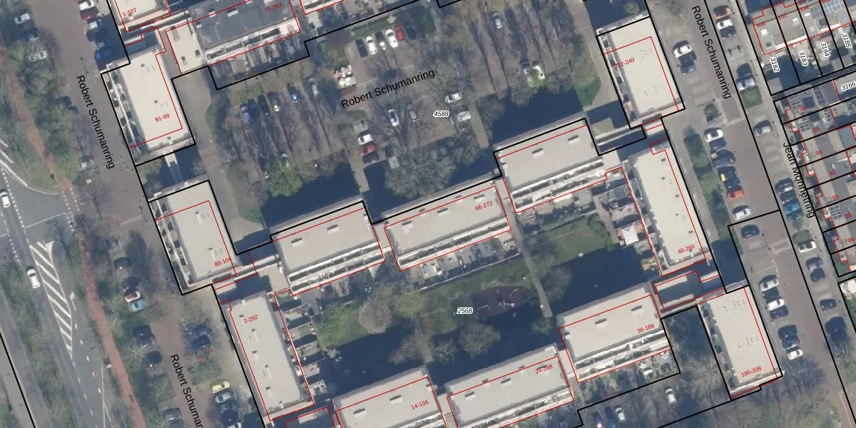 Het perceel waarop Robert Schumanring 72 staat heeft een oppervlakte van 7710 m². Dit is een zeer groot perceel. De perceeloppervlakte wordt geregistreerd door het Kadaster. Gedetailleerde informatie over de maten van dit perceel kunt u vinden in het rapport Kadastrale kaart met maatvoering van Robert Schumanring 72.